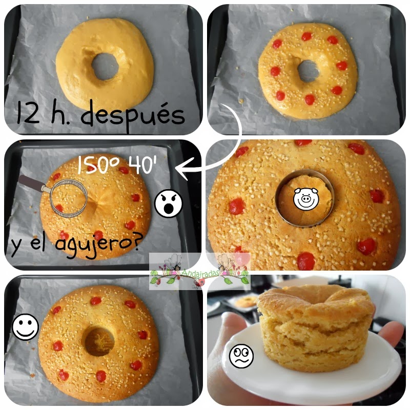 Se agrandó un poco dentro del horno...eso sí.....y hasta se quedó sin el agujero...cosa que solucioné sin complicaciones....y ésta no quedó dura.....ésta se desmenuzaba directamente....no podía ni mojarla en la leche....